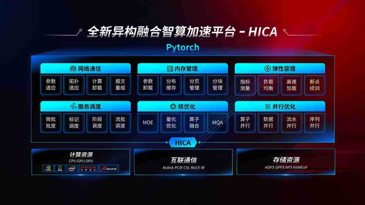 通过自研的服务层、、、中间适配层、、、、以及调度编排算法,,,,采用数据并行、、、、模型并行等多种并行方式,,,,把并行计算任务进行有效的分解,,使其分别由相应的软件栈和算力资源来承接。。。当GPU资源变化,,,HICA可以实时动态调度计算子任务并调整模型拓扑和架构,,,,以充分聚合各种算力资源。。。