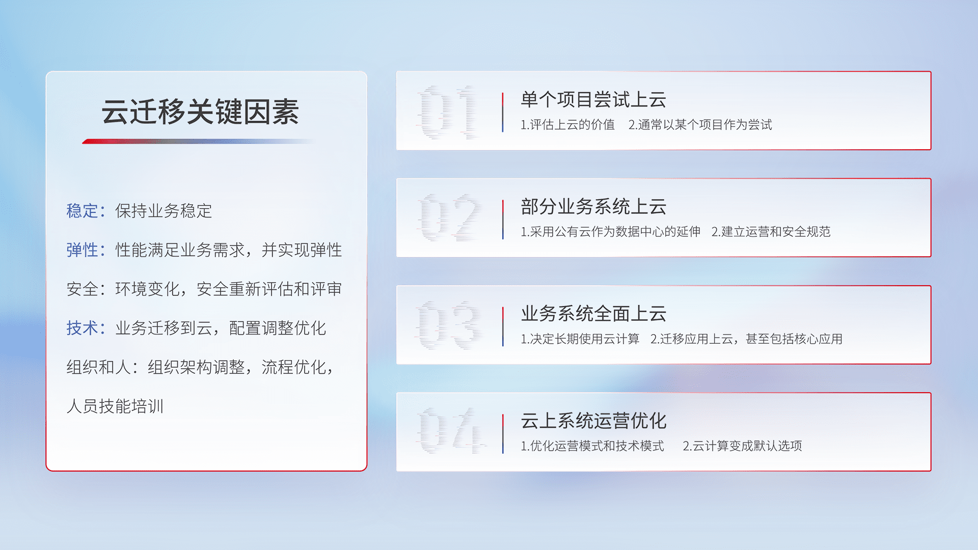 结合实际业务,,从规划设计、、云平台选型、、云原生改造、、数据迁移、、、集成交付,,迁移全过程为客户识别最佳上云路径,,做好风险识别管理,,设计网络架构、、身份权限、、、、安全审计合规、、、操作审计、、、、日志审计、、监控告警策略、、、多站点容灾设计等,,,,对云上基础设施进行整体规划,,,提升IT治理水平,,,,以满足弹性、、、、高可用、、、高性能的需求。。。。