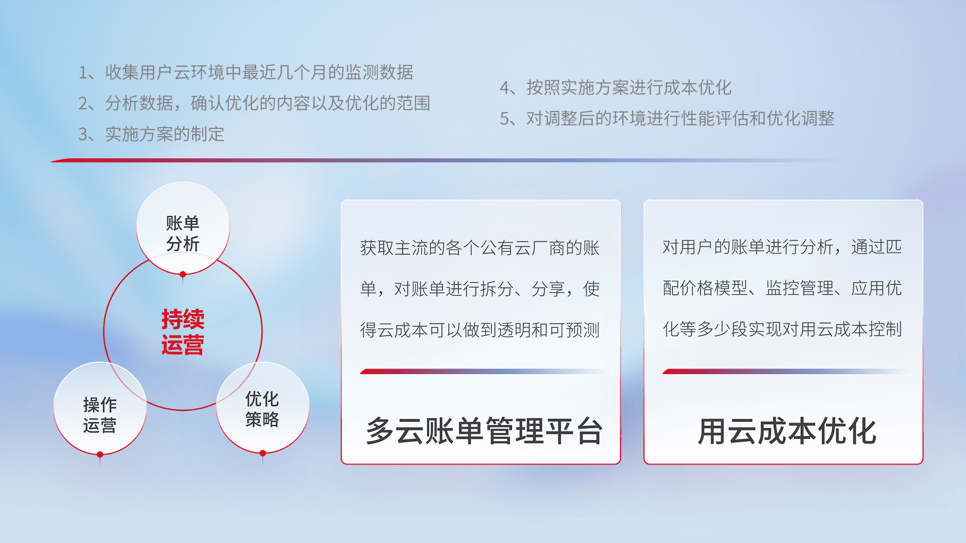 通过多云纳管,,,以统一的资源数据模型把客户的云资源进行抽象和封装,,,进而实现对多云资源的统一操作,,,保障云资源管理的可靠性、、稳定性与可用性。。。量身定制化运维内容,,,配置、、、开发运维、、、、补丁管理、、、、备份、、、、监控、、、、认证和访问管理、、审计和日常巡检等,,,保障在用云过程中的可靠度,,,稳定度以及高可用率。。。