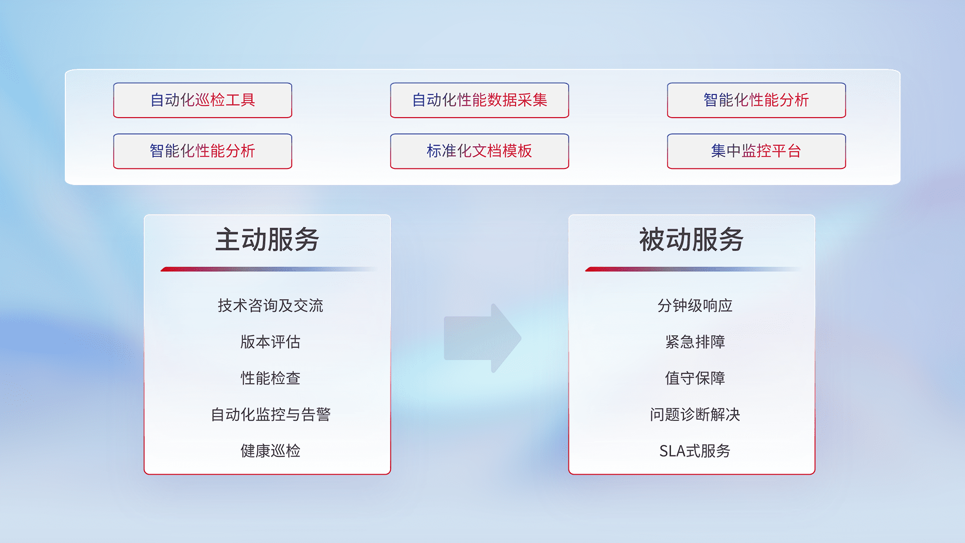 智能化工具和标准化文档,,,保障服务质量,,,,提供主动服务(包含技术咨询、、版本评估、、、性能检查、、、、自动化监控与告警、、、、健康巡检)和被动服务包含(分钟级响应、、紧急排障、、、值守保障、、、问题诊断解决、、、、SLA服务)。。。。