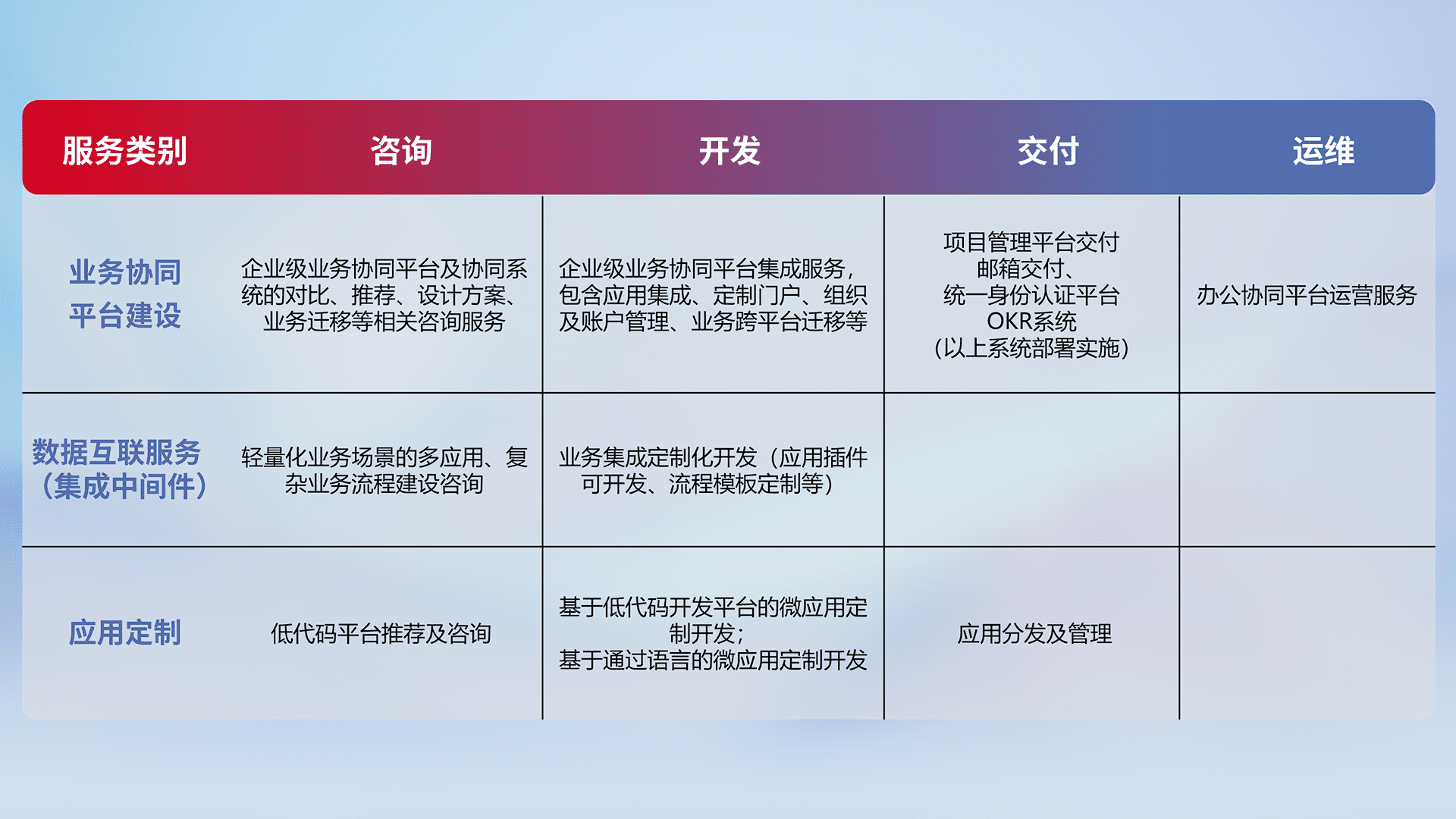 针对钉钉、、、、企微、、IDaas等平台级产品提供产品的规划、、、方案、、、交付、、、定制化开发等服务,,,实现如统一协同办公、、智能客户服务、、、混合会议管理、、、、智能数据查询、、等业务场景,,,,实现数字化转型。。。。
